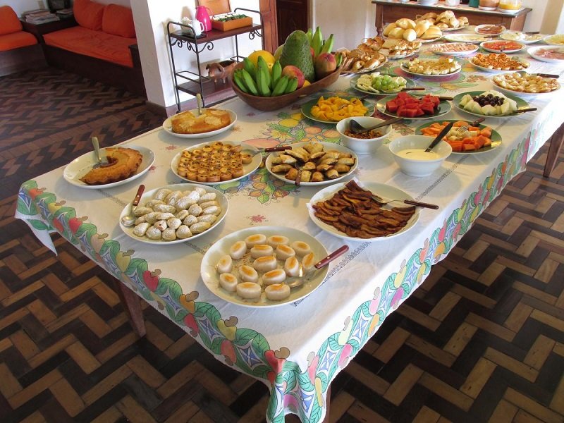 Diariamente, das 7h30 às 10h15, são servidos quitutes que misturam gastronomia baiana aos segredos da doceria italiana, produzidos com a expertise da proprietária Fernanda Cabrini. Todas as delícias são preparadas ali mesmo, na cozinha da pousada. As mesas estão dispostas numa varanda fresca, confortável e florida, com a deslumbrante vista da Baía.