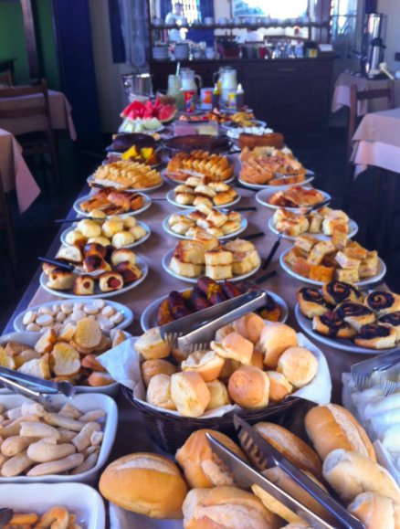 Sem dúvidas, o café da manhã é um dos pontos altos da hospedagem. Com mais de 30 itens, inclui mais de quatro tipos de bolos, pães, raízes, sucos, iogurte e frutas. Não saia sem provar a casquinha, pão de queijo assado em uma forminha de empada, receita de família dos donos da pousada.