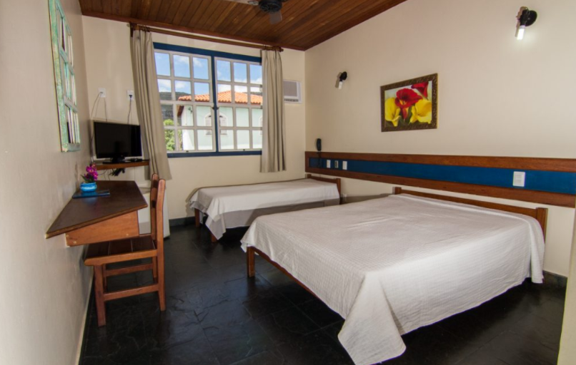 Os quartos são amplos e têm estilo rústico, casando bem com a ambiência histórica que envolve o Centro da cidade. Os apartamentos são confortáveis e sem luxo, com opção de acomodação para até cinco pessoas. As acomodações têm ventilador de teto e/ou ar-condicionado, mas dependendo da época do ano, você não vai usar. O chuveiro é bem quentinho, por conta do aquecimento central de água. Com certeza você vai precisar no cair da tarde, quando a temperatura esfria, às vezes, até mesmo no verão. TV a cabo e wifi são outras facilidades.