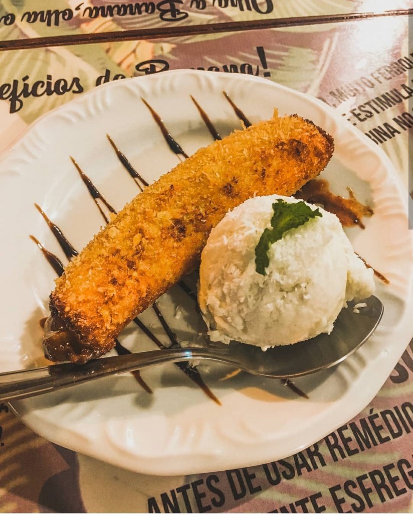 Banana da terra empanada na tapioca, recheada com chocolate e acompanhada de sorvete de coco