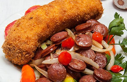 Banana recheada com quatro queijos e acompanhada por calabresa