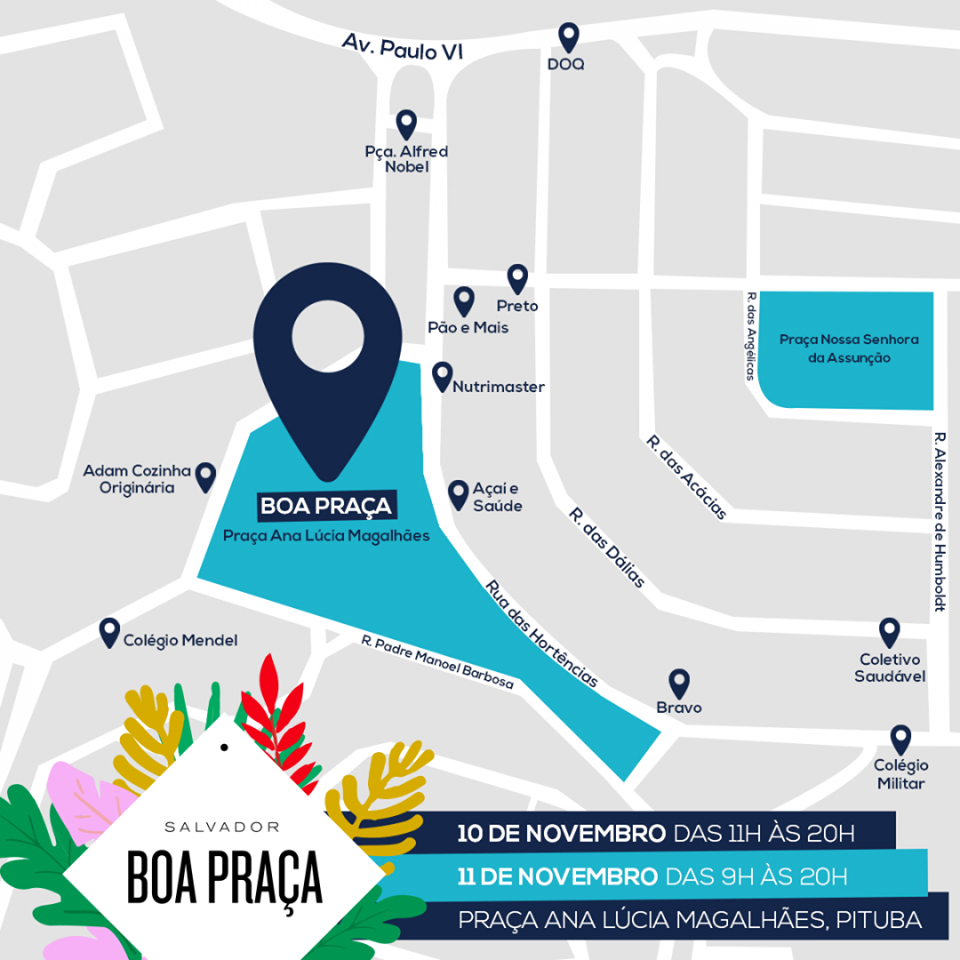 A Salvador Boa Praça anuncia sua nova temporada. A feira que conquistou Salvador será realizada na Praça Ana Lúcia Magalhães, na Pituba, com muita música, gastronomia e artesanato. Anote na agenda: dia 10 de novembro, das 11h às 21h; e 11 de novembro, das 9h às 20h.